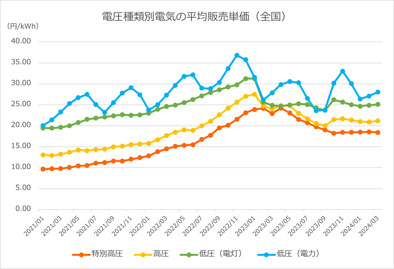 この措置の影響もあり、2023年は電気料金が低圧・高圧など契約電力の種類を問わず値下がり傾向がみられました。