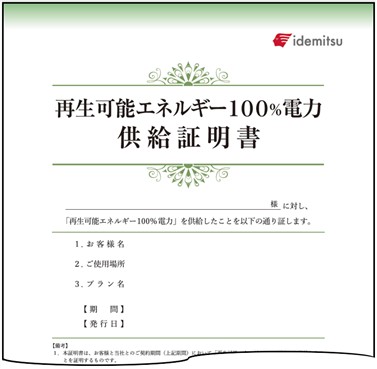 特別高圧・高圧でプレミアムグリーンプラス(CO2フリー)またはグリーンプラス(CO2フリー)のオプションプランを契約すると、出光興産が独自に発行する「供給証明書」(サンプル下図)を受け取れます。